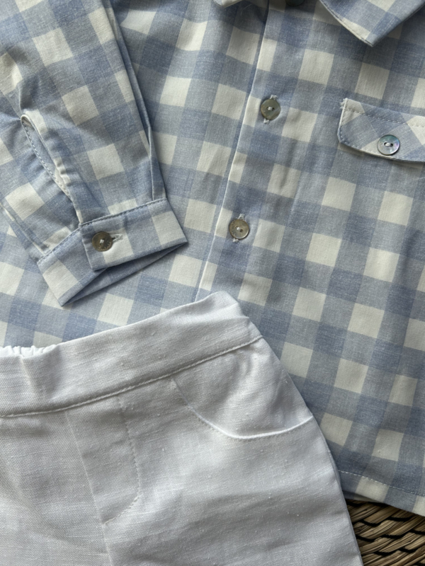 Prachtig tweedelig setje van Deolinda voor een zomers outfit. Het lichtblauwe geruite overhemd heeft knoopjes aan de mouwen waardoor hij opgerold kan worden en vastgezet. Het broekje heeft een elastisch tailleband en is van heerlijk luchtige stof.